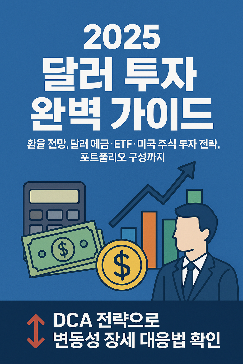 2025년 달러 투자 완벽 가이드. 환율 전망, 달러 예금·ETF·미국 주식 투자 전략, 포트폴리오 구성까지. DCA 전략으로 변동성 장세 대응법 확인